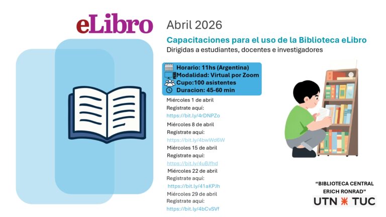 ¿Querés aprender a aprovechar al máximo la Biblioteca eLibro? Se encuentran abiertas las capacitaciones virtuales dirigidas a estudiantes, docentes e...