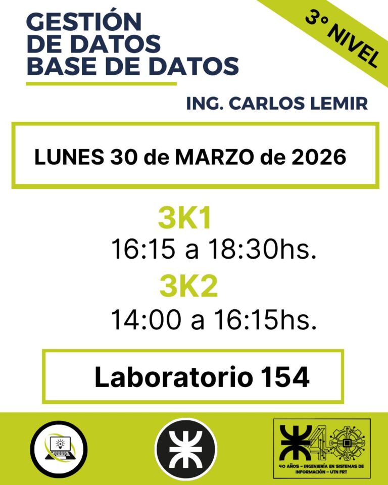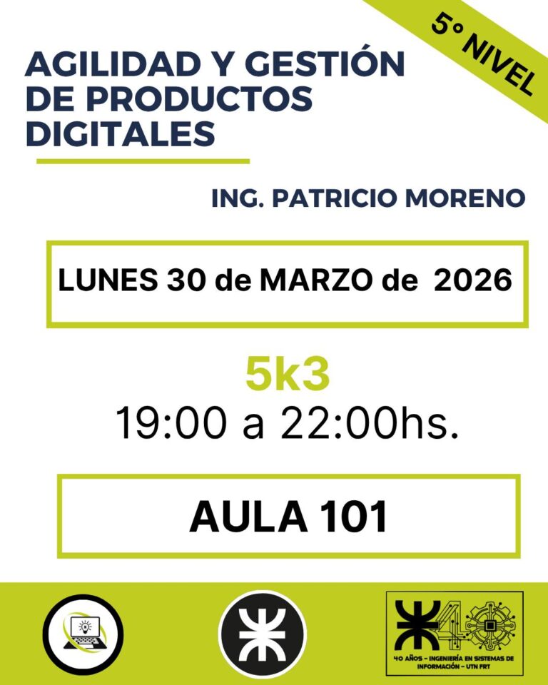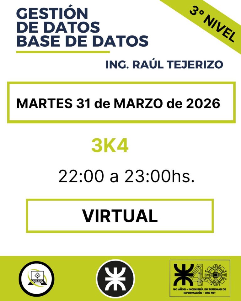 La clase se desarrollará en modalidad virtual. Docente: Ing. Raúl Tejerizo. Martes 31 de marzo 22:00 a 23:00 hs. Zona...