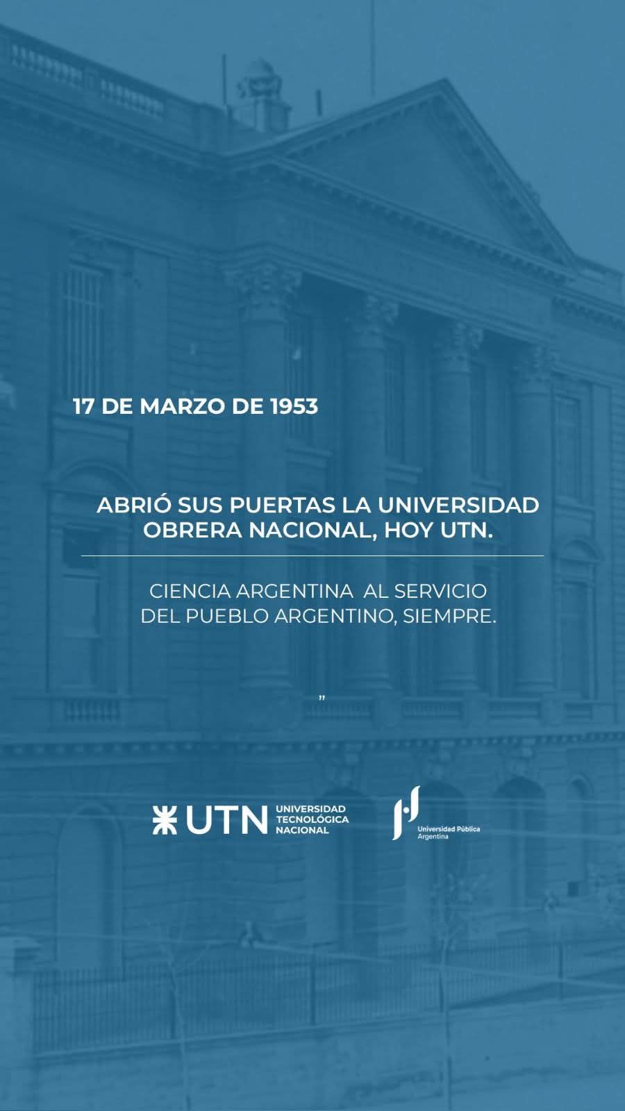 El 17 de marzo de 1953 se inauguró el primer ciclo lectivo de la Universidad Obrera Nacional, hoy UTN.