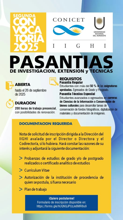 El Instituto de Investigaciones Geohistóricas (IIGHI) informa que se encuentra abierta la segunda convocatoria de pasantías regulares destinadas a estudiantes...