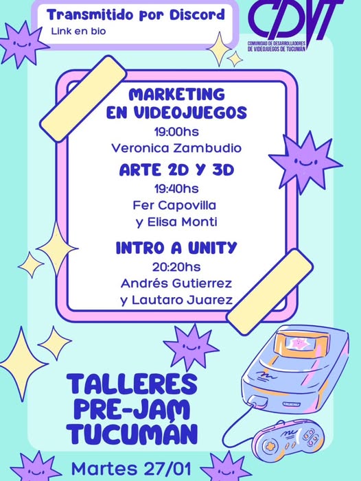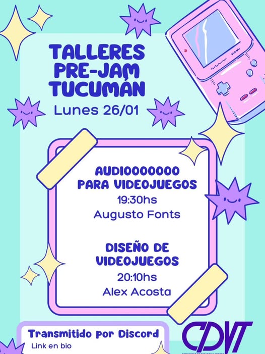 Del lunes 26 al jueves 29 de enero, la Comunidad de Desarrolladores de Videojuegos de Tucumán (CDVT) organiza una serie de talleres pre-jam, dictados vía Discord, pensados para llegar mejor preparados/as a la Global Game Jam 2026.